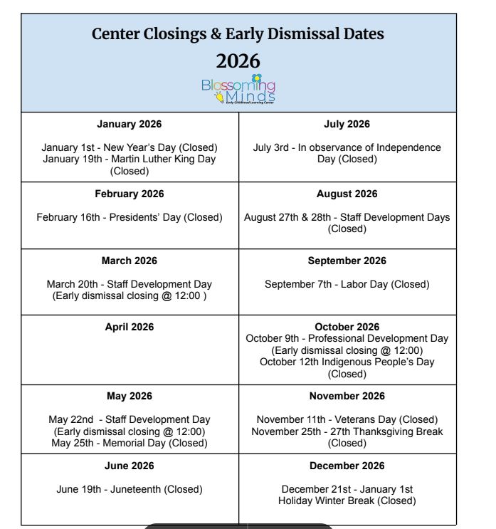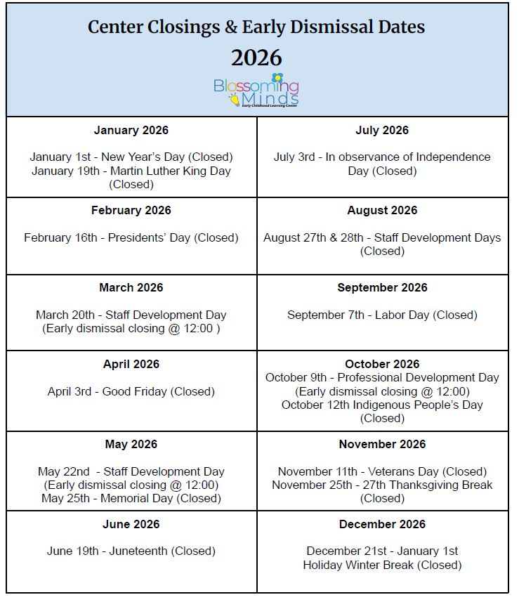Blossoming Minds understands that our decision to open, close or delay school opening during inclement weather often disrupts family schedules. We also understand that our children are better served – academically, emotionally and socially by being in our daycare. Our top priority is the safety of our families and staff. The decision for Blossoming Minds to close, delay, or early dismissal takes into account all aspects of everyone involved.